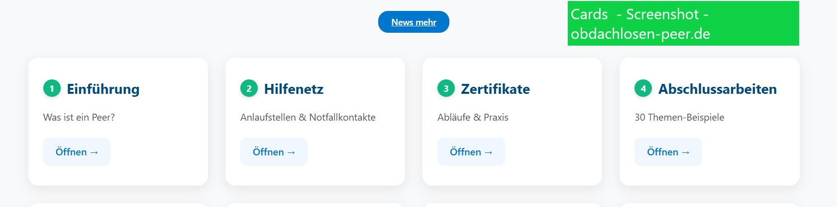 Derzeit ist die Plattform unter www.obdachlosen-peer.de noch nicht online, steht aber kurz vor der Gesamtveröffentlichung. Das MVP ermöglicht es, Nutzungsmuster zu beobachten, Rückmeldungen zu sammeln und die Plattform gezielt zu verbessern. Gleichzeitig dient es als startende Wissenssammlung, die im Laufe der Zeit kontinuierlich erweitert werden kann – Inhalte, Links und Beispiele können fortlaufend ergänzt werden, sodass die Plattform langfristig wächst.